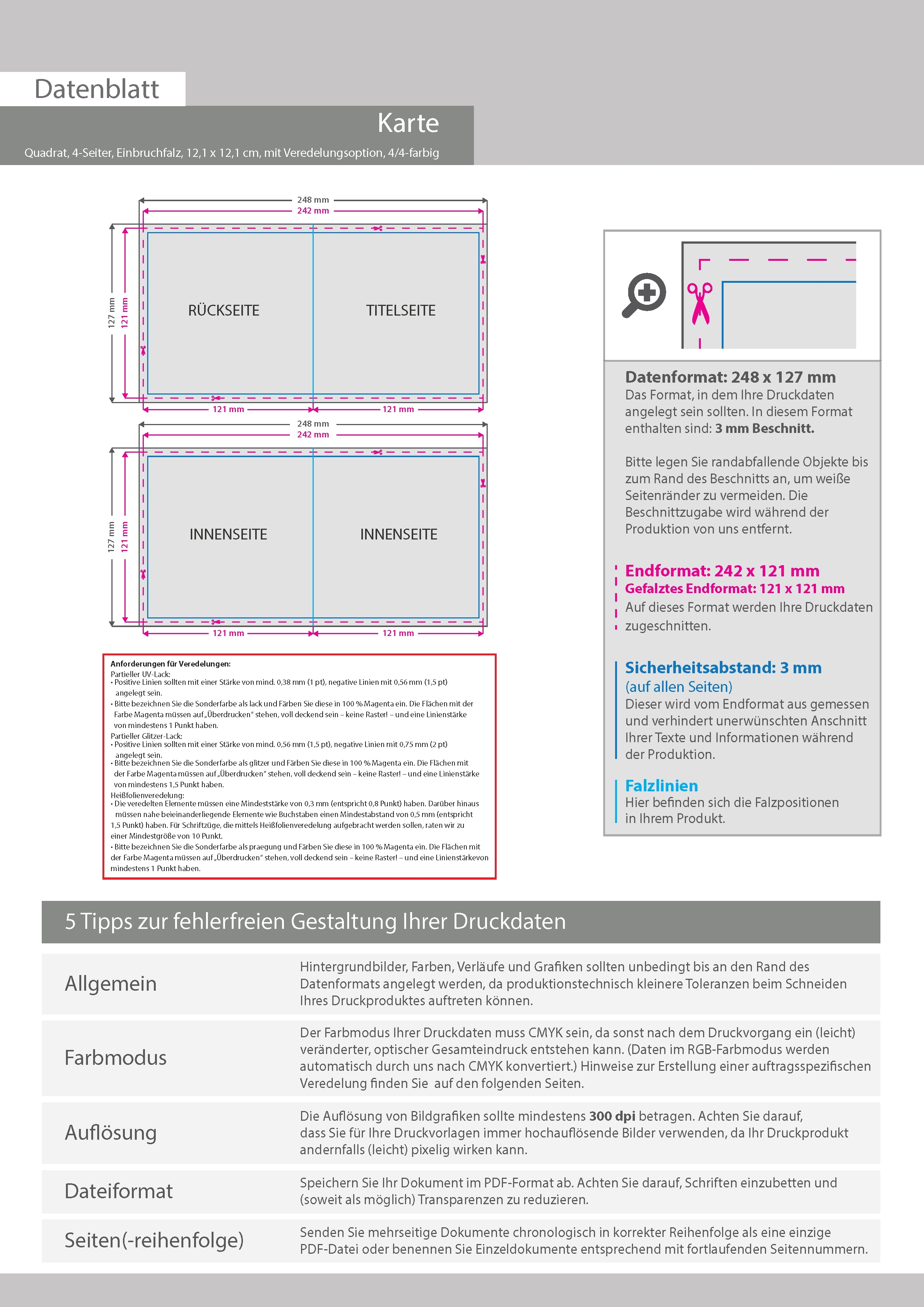 Postkarte, gefalzt auf Quadrat 12,1 x 12,1 cm, 4-seitig, mit allen Veredelungskombinationen